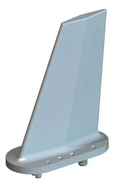 The antenna is constructed with a high-strength, high-temperature CE9000 composite blade (per FMS1023) in an aerofoil shape, supporting the radiating element. An aluminum alloy baseplate houses the matching circuitry and integrates the diplexer box with its coaxial connectors.