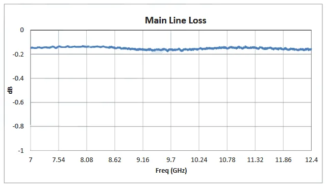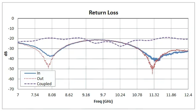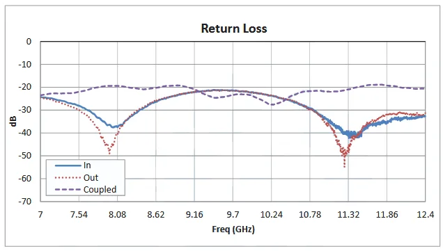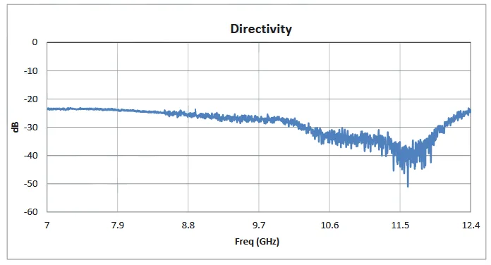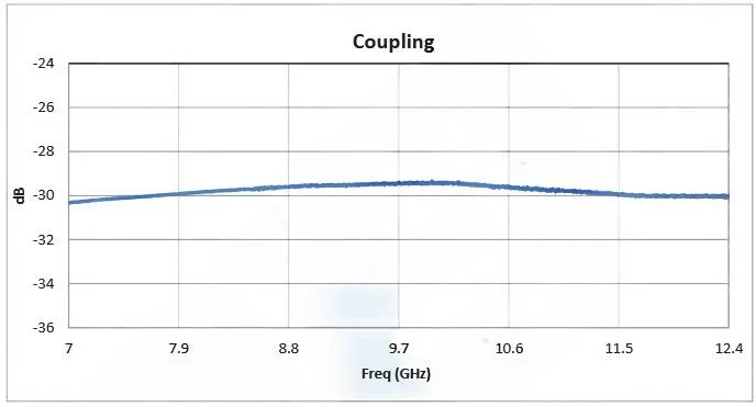 This 30 dB directional coupler operates across a frequency range of 7 to 12.4 GHz and supports up to 50 Watts of continuous wave (CW) power. It features a minimum directivity of 17 dB and a maximum VSWR of 1.3:1, making it ideal for applications requiring accurate signal sampling and measurement.