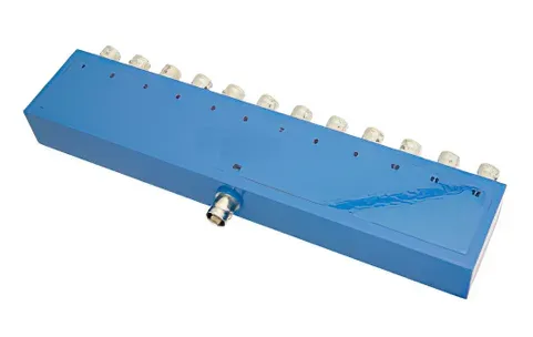 This 12-way RF power divider features a reactive design and operates over a frequency range of 2 MHz to 500 MHz. It has a 50 Ohm impedance, supports up to 1 Watt input power, and is equipped with one BNC female input and twelve BNC female output ports. The design offers a maximum input VSWR of 1.5:1, minimum port-to-port isolation of 20 dB, and minimal insertion loss. Suitable for signal distribution and test setups in RF systems.